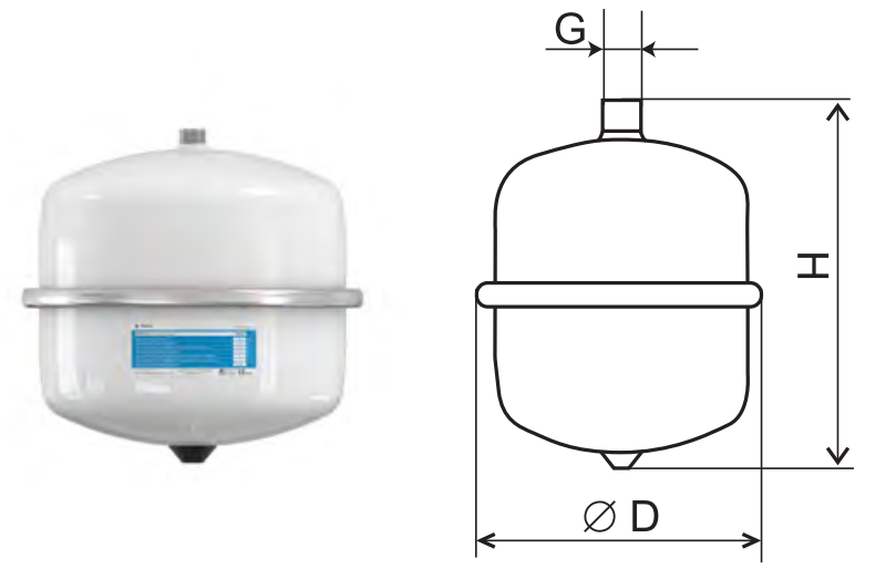 | Марка | Предвар. давление (бар) | Коэф. заполнения, (%) | Габаритные размеры, (мм) | Присоед. внешняя резьба, G | Масса, (кг) | Макс.раб. давлением, (бар) | ||