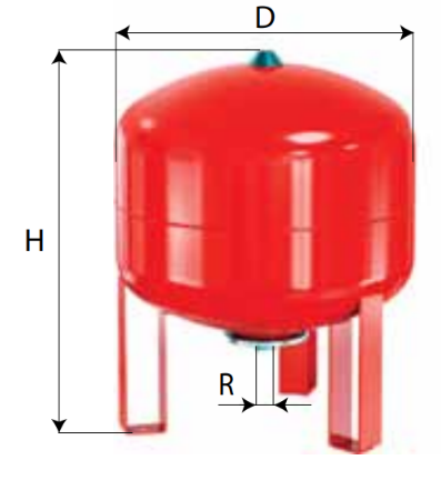 | Параметры - Температура рабочей среды: –10…+70 °С. - Максимальное давление: 0,6 МПа. - Мембрана — резина EPDM. - Предварительное давление газа в газовой камере: 0,15 МПа. - Максимальное предварительное давление газа в газовой камере: 0,4 МПа. - Максимальный коэффициент заполнения баков: 63%. - Расширительные баки изготавливаются без манометра. - Подключение к системе снизу. |